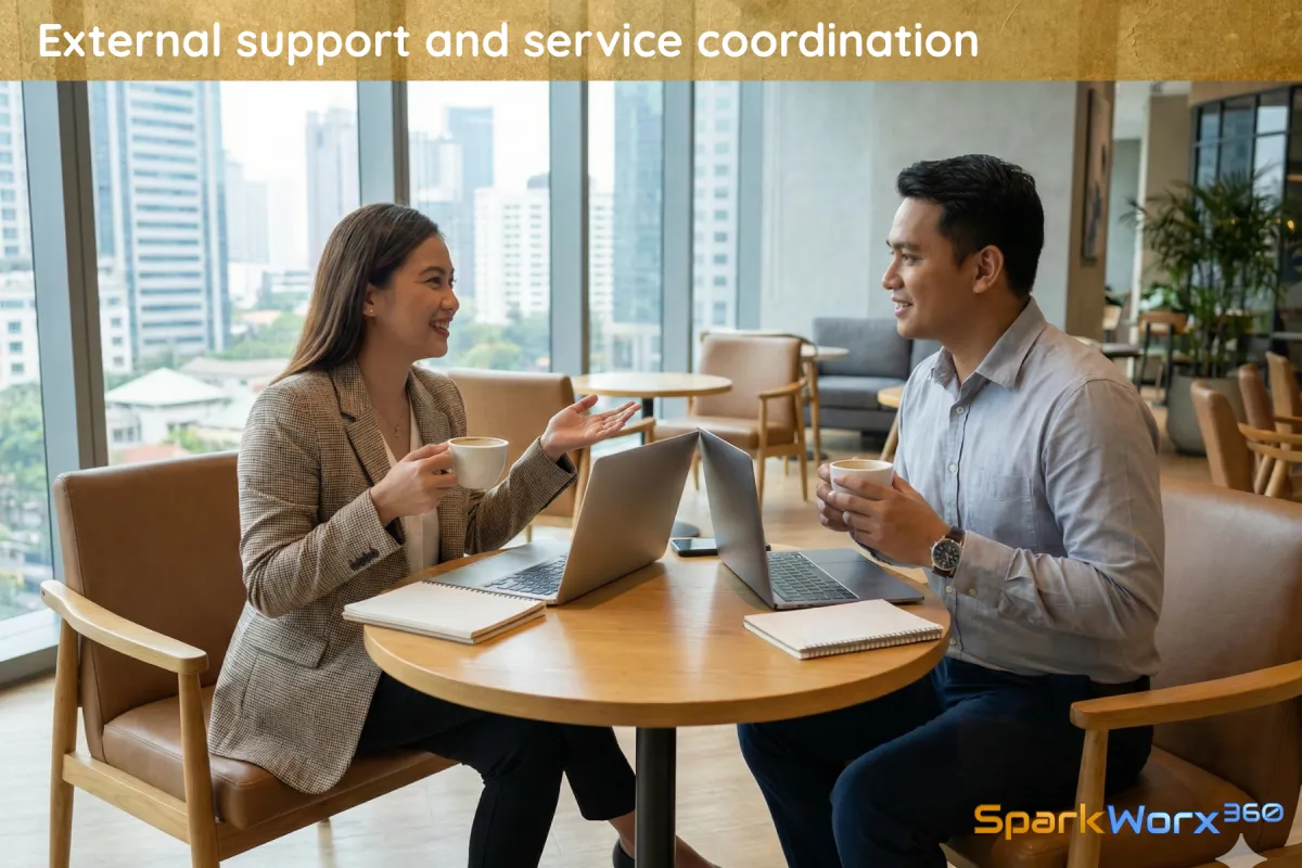 Advising on when to outsource, hire, or engage service providers, including access to accounting, bookkeeping, and other support services through structured systems.